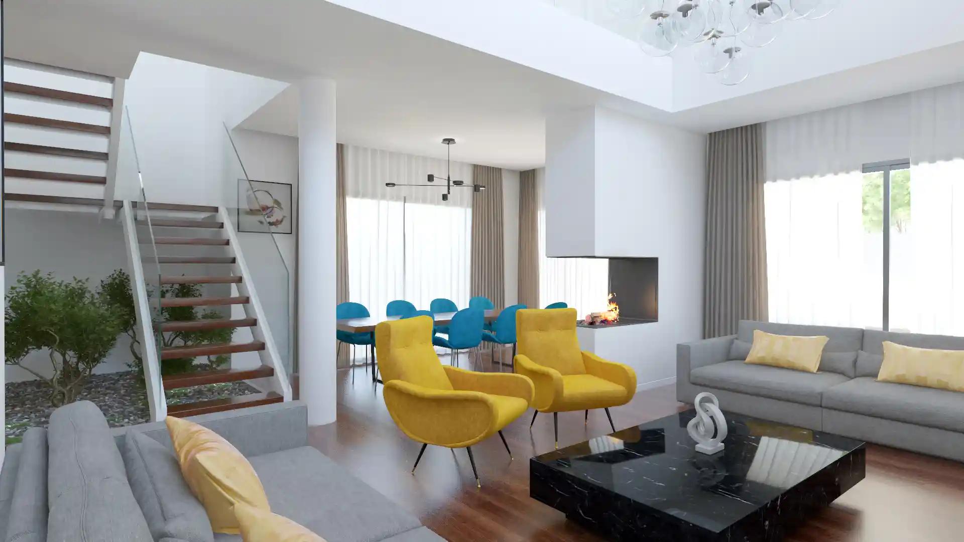 En el interior, el vacío central articula la doble altura del salón, llenando el espacio de luz y de aire. La escalera, liviana y elegante, flota entre el jardín interior y el programa doméstico. Las zonas comunes —salón, comedor y cocina— se comunican con fluidez, pero sin perder identidad.